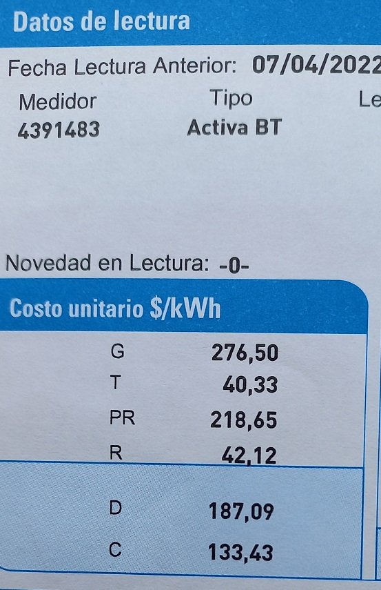 Según lo que se lee en la factura de Afinia el costo unitario, determinado por ley, para el mes de abril debió ser de $898,12 por kilovatio, sin embargo, la empresa cobró $699,14.