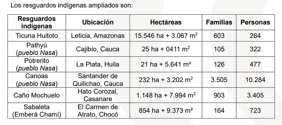 Además, se aprobó la ampliación del territorio para seis resguardos para el beneficio de 15.475 personas en total, con predios de terrenos baldíos de posesión ancestral, y predios del Fondo de Tierras para la Reforma Rural Integral.