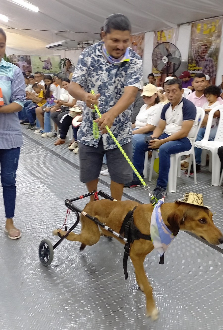 Primero ver a Donatelo, perro de familia seguir algunos comandos de obediencia; pero sin duda, Sobreviviente fue el que se llevó las miradas de admiración porque se mueve, con ayuda de un caminador, ya que sus patas traseras quedaron inmóviles debido a que fue atropellado en la vía entre Montería y Cereté y abandonado dos días, hasta que fue rescatado por una familia de Cereté que lo adoptó y lo cuida.