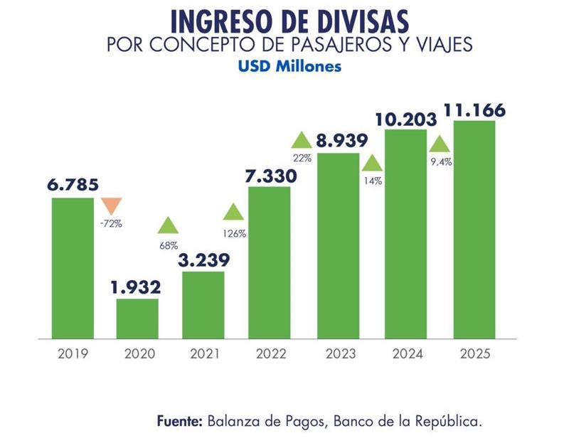 El turismo deja más de US$ 11.166 millones en divisas a Colombia en 2025