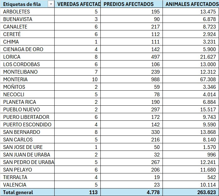 El informe preliminar de la emergencia revela 113 veredas afectadas en 24 municipios, 4.778 fincas damnificadas y 263.623 vacunos y bufalinos en riesgo. “Son miles las familias ganaderas y agricultoras que han tenido que abandonar sus proyectos productivos y sus animales porque sus predios y viviendas están inundadas”, indicó Lafaurie Rivera.